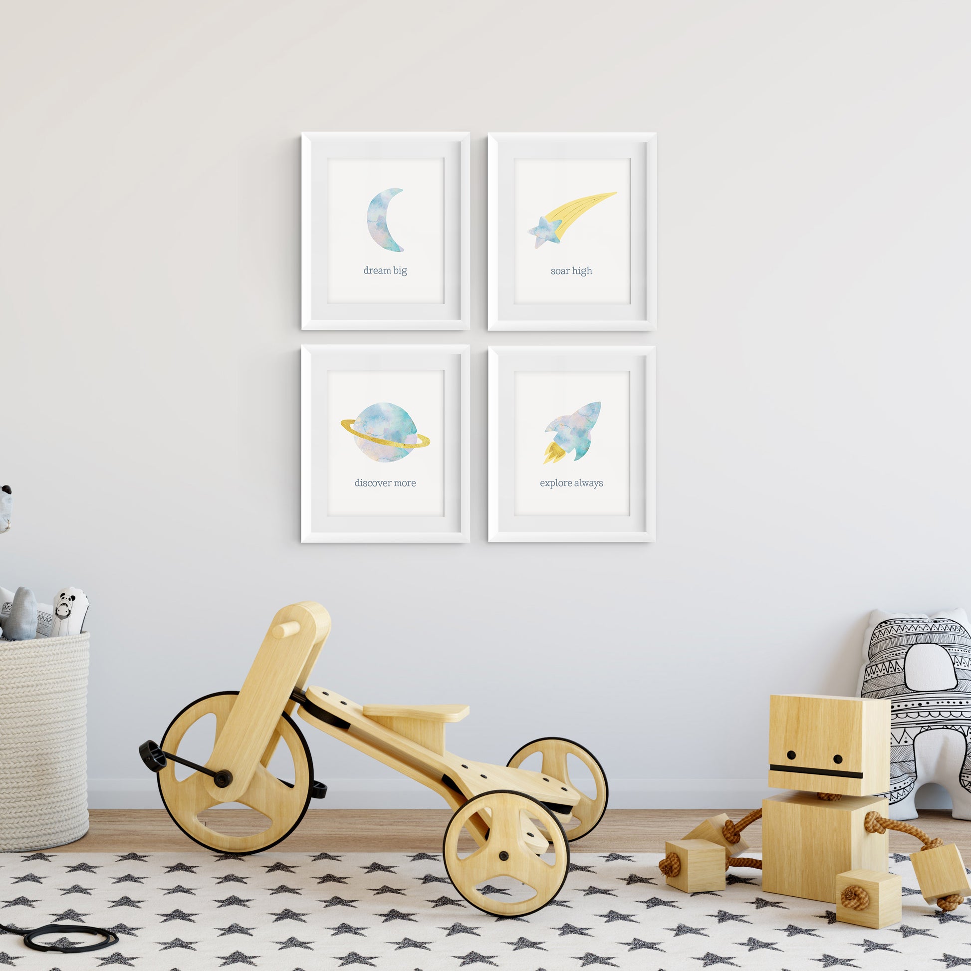 Send your little one off to dreamland surrounded by images of outer space - featuring a shooting star, planet, moon and rocket. Combining empowering messages with adorable designs, this 4-piece set instantly creates a focal point for your nursery, playroom or child's bedroom.