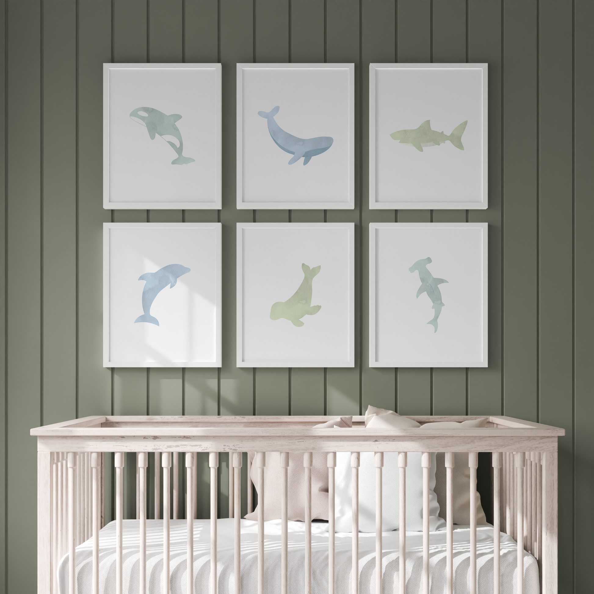Let these soothing watercolors help you create the ocean-themed room of your dreams. This 6-piece print set features aquatic animal illustrations in a sea-inspired color palette. They create an adorable gallery wall for your nursery, kid's room, or playroom.