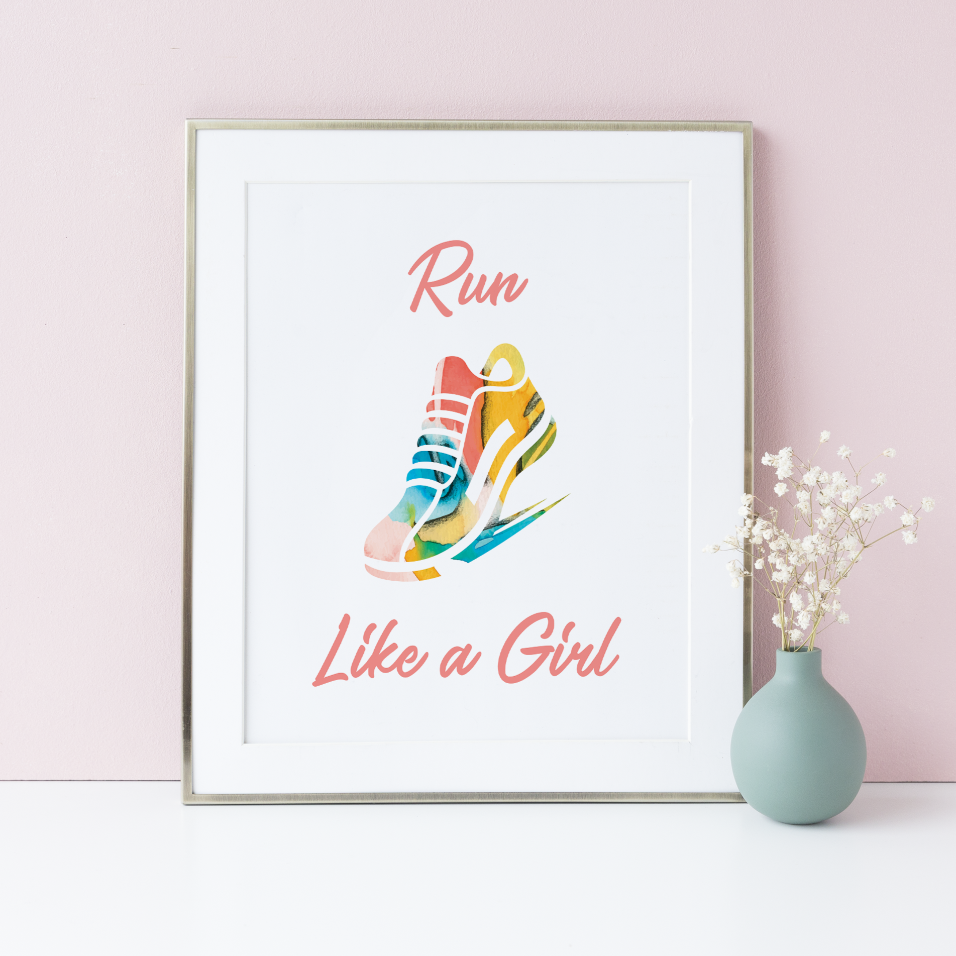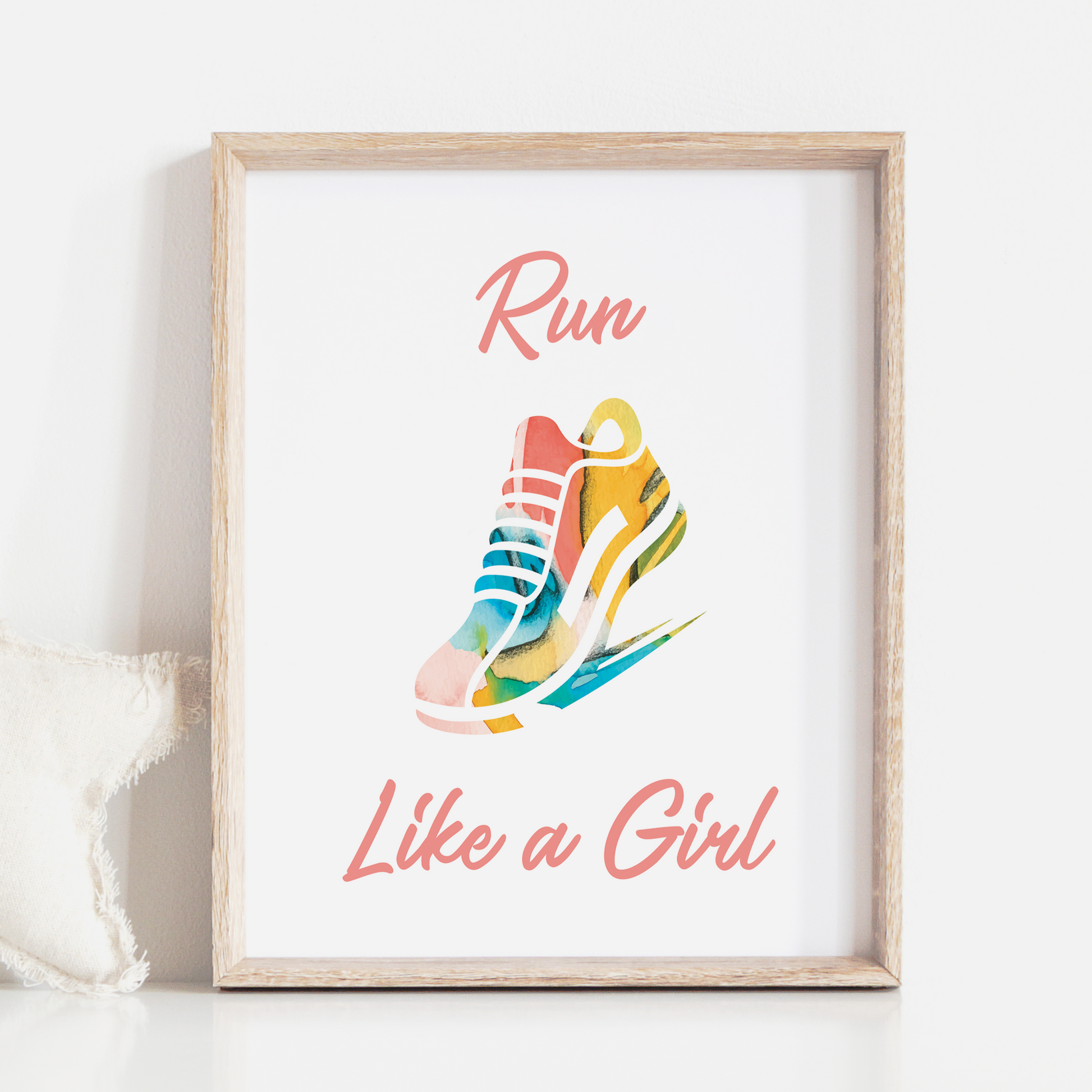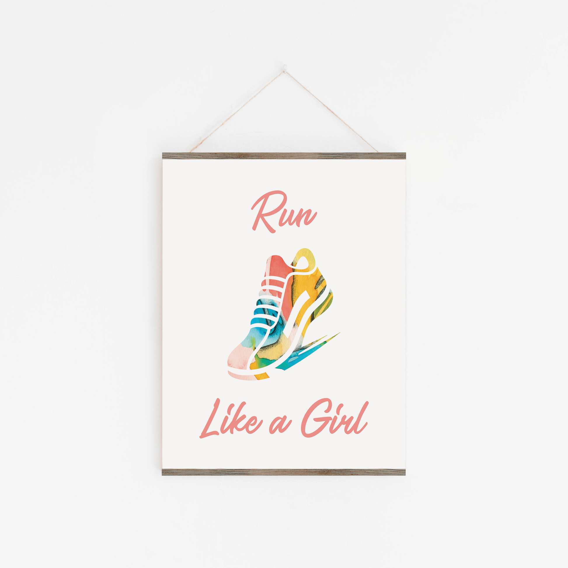 Be proud to run like a girl! This running shoe art print makes the perfect gift for any runner - from the ultramarathoners to those of us working toward our first 5K. It also makes wonderful decor for a girl's room, school locker or sports theme birthday party.